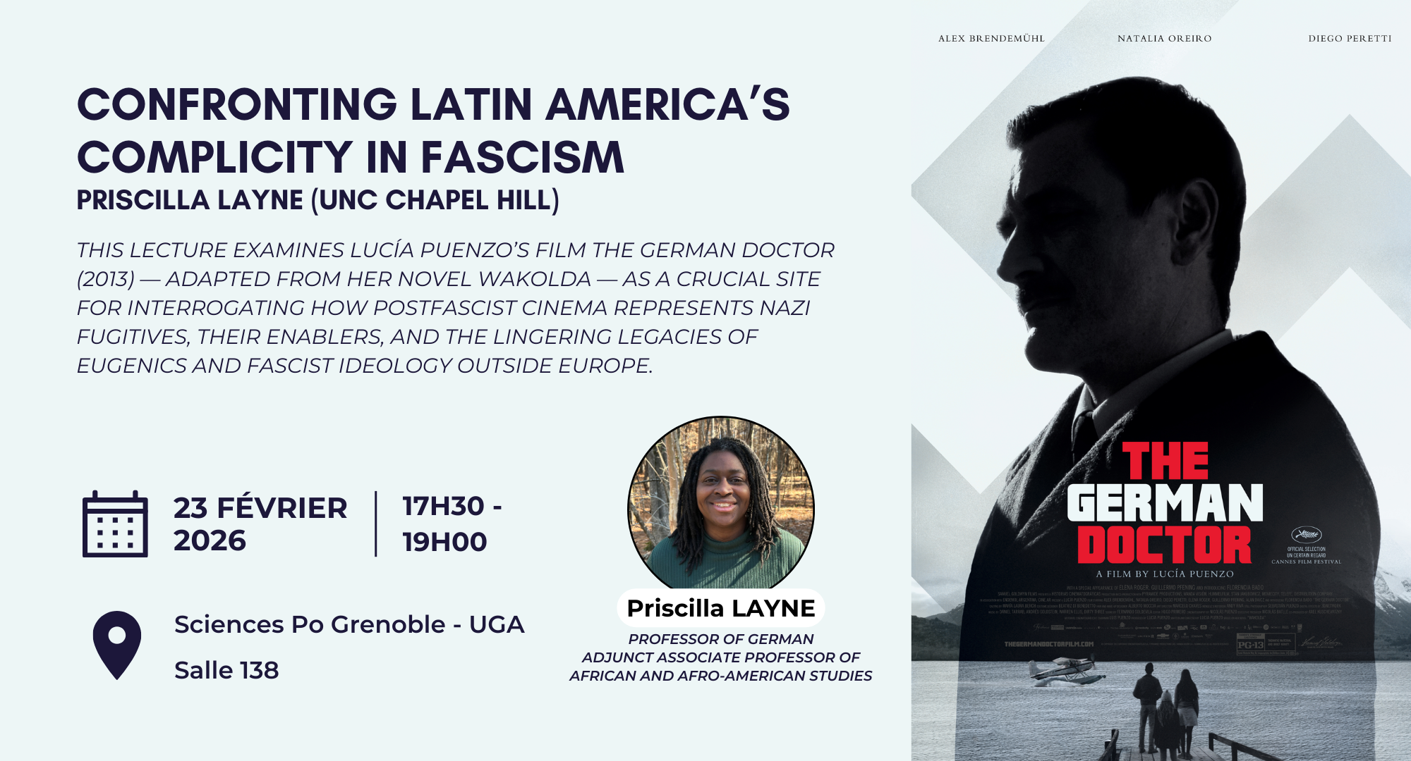Le 23 février, de 17h30 à 19h00, à Sciences Po Grenoble – UGA (salle 138), Priscilla Layne (UNC Chapel Hill) tiendra une conférence intitulée « Confronter la complicité de l’Amérique latine dans le fascisme », qui proposera une analyse du film The German Doctor (2013) de Lucía Puenzo afin d’interroger la représentation des fugitifs nazis, de leurs soutiens et des héritages persistants de l’eugénisme et de l’idéologie fasciste en dehors de l’Europe.
